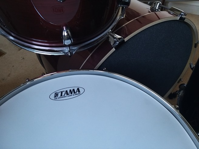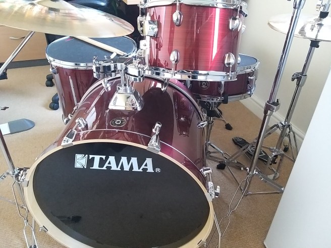 Last April/May I said goodbye to my sh*tty e-kit and said hello to a proper drum kit of my own. The Tama Rhythm Mate 5-Piece kit arrived in a “stream red” with poplar shells and chrome hardware.